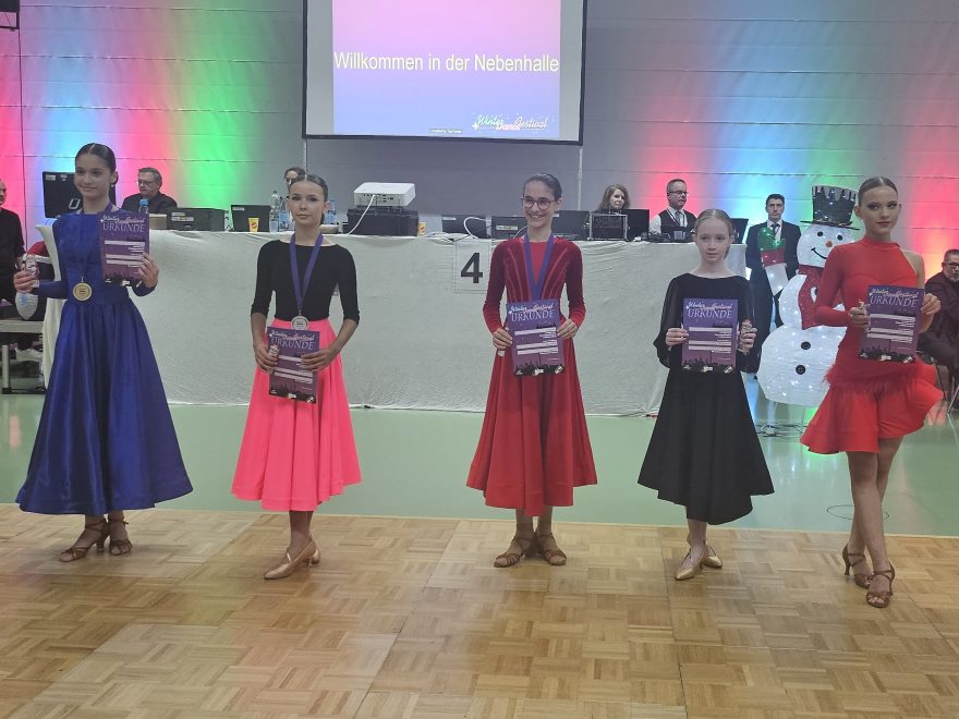 Mit großem Aufgebot reiste der TGC am 3. Adventswochenende nach Mülheim a.d. Ruhr zum inzwischen fast schon traditionellen Winter Dance Festival (WiDaFe) der Tanzjugend. 6 Solistinnen und 5 Tanzpaare gingen am 13. und 14. Dezember an den Start, um an insgesamt 32 Turnieren teilzunehmen. Und das ausgesprochen erfolgreich: Philipp & Alika sowie Aylin qualifizierten sich in ihren WDSF-Turnieren jeweils für die 2. Runde, und ansonsten wurde fast immer die Endrunde erreicht. Außerdem gab es die Aufstiege von Aylin und Melinda in die C-Klasse sowie von Dennis und Sabrina in die Hauptgruppe S Standard zu feiern. Es soll auch nicht unerwähnt bleiben, dass der TGC nicht nur auf den Tanzflächen stark präsent war. Weitere 7 Mitglieder unterstützen die Veranstalter tatkräftig bei der Durchführung: Patric (Musik, Auf-u. Abbau), Silvia (Catering), Robert (Catering + Wertungsrichter), Heike (Deko), Bettina (Wertungsrichter), Anna (Siegerehrung) und Sabine (Rechenzentrum). Hier eine Auflistung der WiDaFe-Ergebnisse: Solo-Tänzerin Klasse Datum Platz Aliona Junioren I C Latein 13.12.2025 7 Junioren I C Standard 13.12.2025 7-9 Junioren I C Latein 14.12.2025 8-9 Junioren I C Standard 14.12.2025 2 Aylin WDSF Open Latin Female Junior II 13.12.2025 22-23 Junioren II D Standard 13.12.2025 2 Chiara-Noelle Junioren II D Latein 13.12.2025 6 Junioren II D Latein 14.12.2025 3 Emilia Junioren II C Latein 13.12.2025 1 Junioren II C Standard 13.12.2025 1 Jugend C Standard 13.12.2025 1 Maiia Junioren II D Latein 13.12.2025 2 Melinda Jugend D Latein 13.12.2025 6 Hauptgruppe D Latein 13.12.2025 3 Jugend D Latein 14.12.2025 1 Hauptgruppe D Latein 14.12.2025 4 Paar Klasse Datum Platz Dennis & Sabrina WDSF Open Standard Rising Stars 13.12.2025 8 Hauptgruppe A Standard 14.12.2025 2 Jan & Alice Junioren II C Standard 13.12.2025 3 Jugend C Standard 13.12.2025 5 Junioren II C Standard 14.12.2025 2 Jugend C Standard 14.12.2025 3 Jonas & Julia Hauptgruppe B Standard 13.12.2025 5 Matteo & Alessia Jugend B Latein 13.12.2025 13-14 Hauptgruppe B Latein 13.12.2025 6 Jugend B Latein 14.12.2025 7 Hauptgruppe B Latein 14.12.2025 2 Philipp & Alika Jugend B Latein 13.12.2025 7 Jugend B Standard 13.12.2025 5 WDSF Open Latin Youth 13.12.2025 22-23 Jugend B Latein 14.12.2025 6 Jugend B Standard 14.12.2025 3 Es waren aber auch noch zwei unserer älteren Tanzpaare unterwegs: Bernd & Jasmin ertanzten sich beim 1. Nordhessisches Adventsturnier in Kassel in der Masters II C Standard den 3 Platz. Matthias & Juta legten bei der TBW-Trophy in Ludwigsburg mit ihrem 4. Platz eine Punktlandung hin: mit exakt 75 Punkten stiegen sie in die Masters IV A Standard auf.
